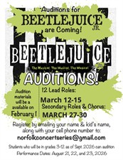 Norfolk Concert Series kids summer music theater will present Beetlejuice Jr. on August 21- 23. Rehearsals begin in June and will be held primarily on weekends and evenings.